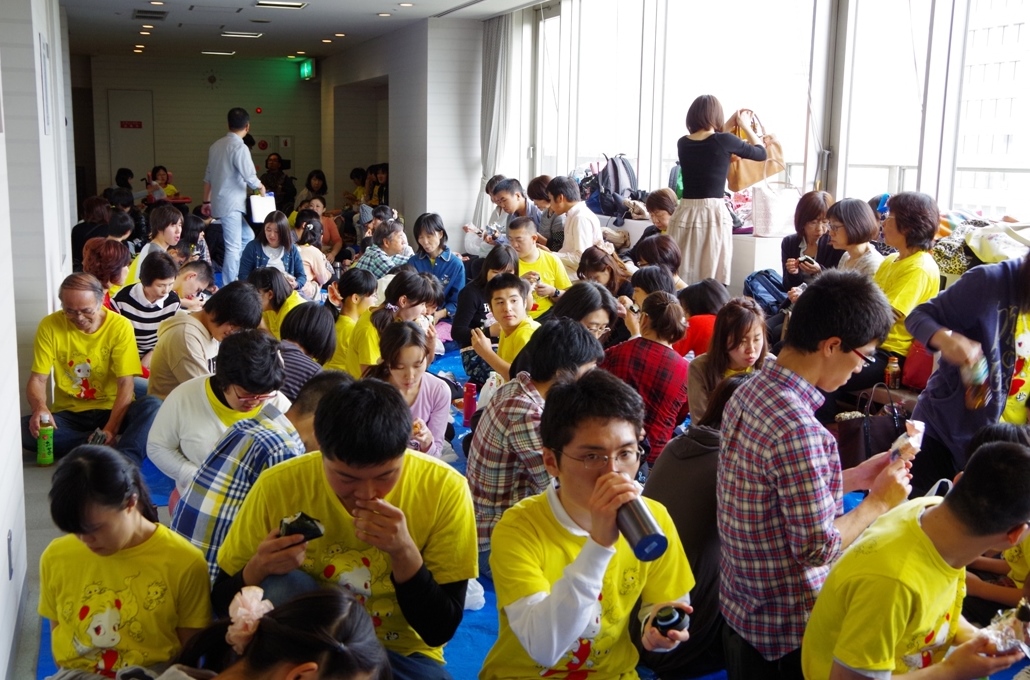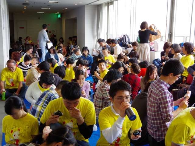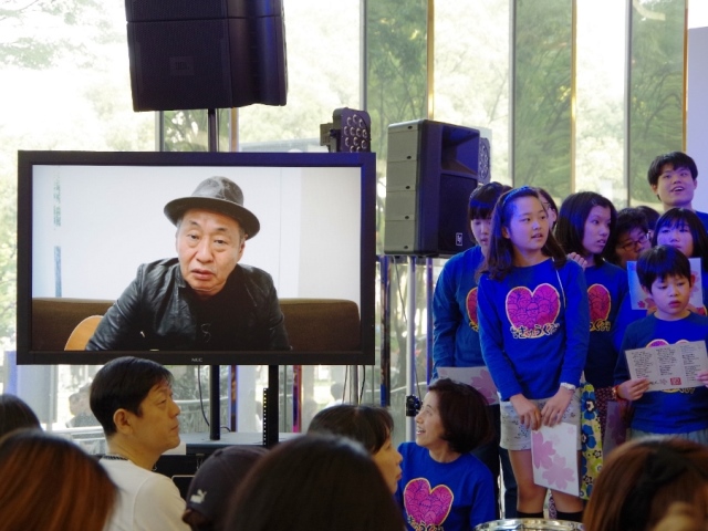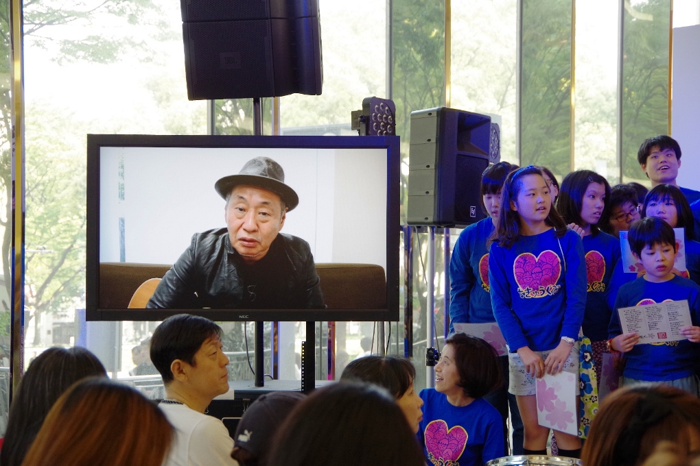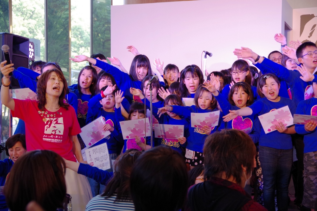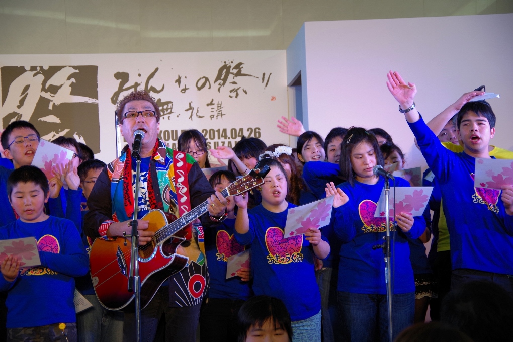 地球組は嘉門達夫さんと「さくら咲く」を大合唱するのが恒例。泉谷しげるさんからビデオレターも届きました!(ピンクのTシャツは矢野きよ実さん、はち丸の横、黄色のシャツは河村名古屋市長。一番右はオカザえもんの兄です)