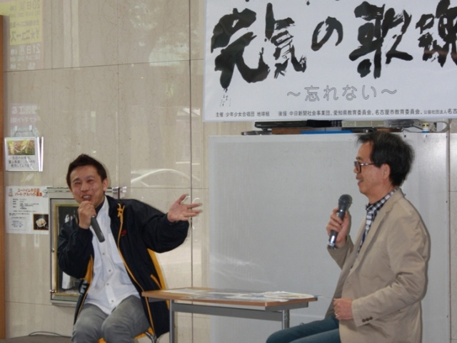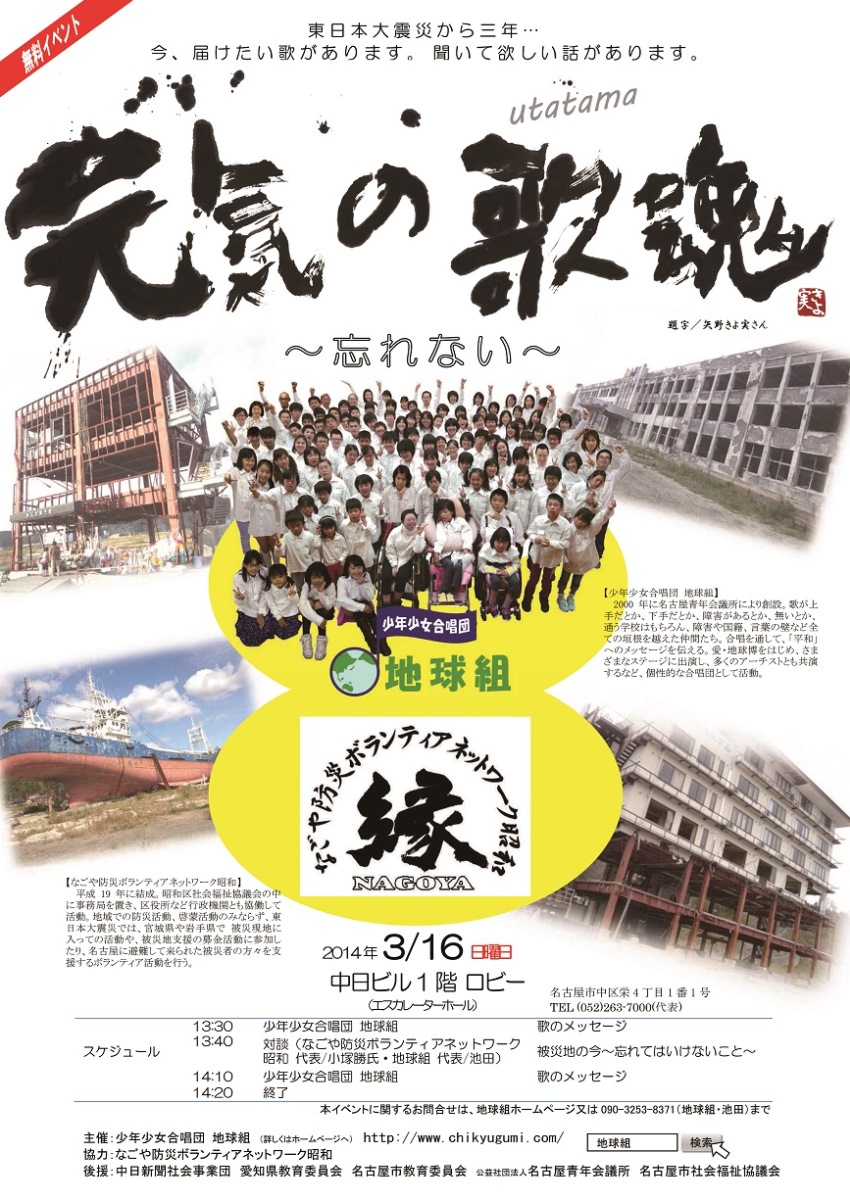 昨年は同テーマでありながら、「被災地を忘れず、苦難な中で生活されている方々を忘れず、心を寄せて、復興を願う心。」を『~忘れない~』と伝えるべく、構成しました。今年は、地球組が被災地の皆様のみならず、名古屋の皆様に聞いて頂きたいメッセージを込めた歌を歌うと共に、「なごや防災ボランティアネットワーク昭和」代表の小塚氏にも協力を頂き、震災後三年を機に、私たちが忘れてはいけない事は何なのかを考え、対談を通して来場者の方々に訴えました。