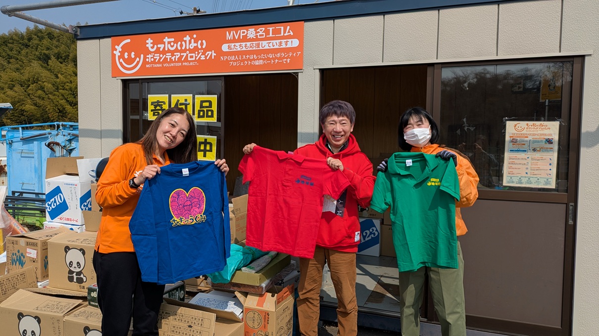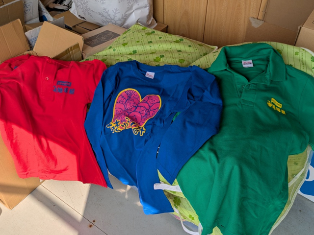 2007年に作った二着目のユニフォーム(緑の半そでのポロシャツ)、2009年に作ったユニフォーム(赤の半そでのポロシャツ)、そして、地球組の第二期生メンバーの絵梨さんが2010年にデザインしたユニフォーム(紺の長袖Tシャツ)、約300枚を昨年同様に「もったいないプロジェクト」さんにお届けしました。